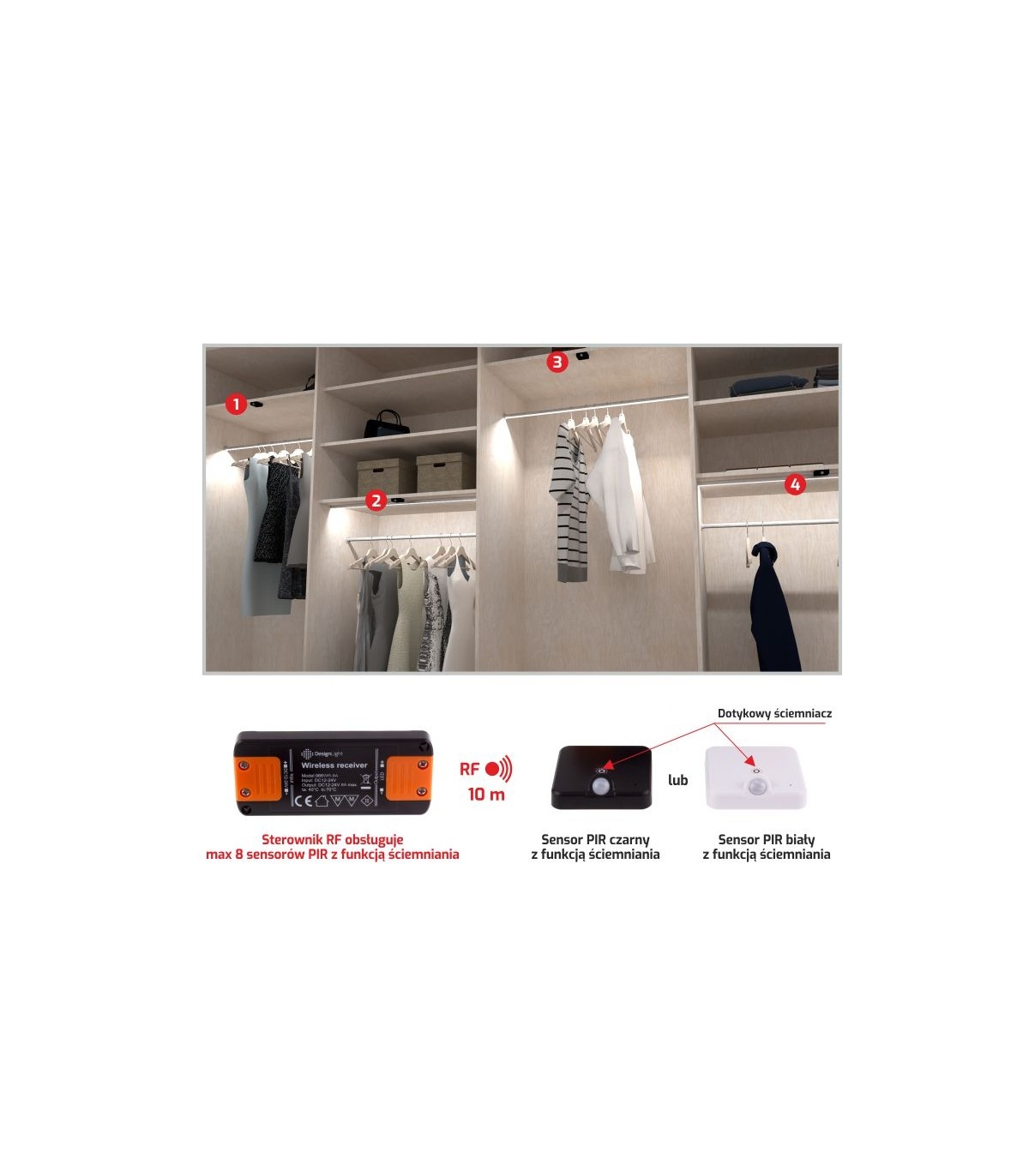Zestaw DELI 2 pozwala na bezprzewodowe sterowanie oświetleniem LED w szafie lub garderobie z wieloma drzwiami. W skład zestawu wchodzi sterownik RF oraz sensor PIR ze ściemniaczem.